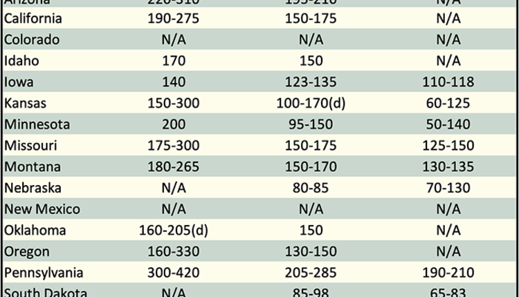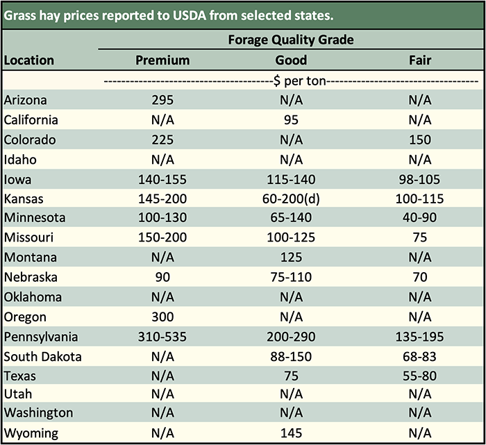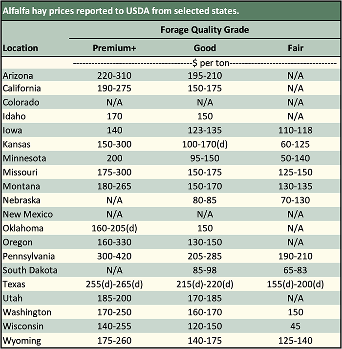 Below are examples of alfalfa and grass prices being paid FOB barn/stack (except for those noted as delivered, which are indicated by a "d" in the table below) for selected states at the end of the day on February 13. Large ranges for a particular grade and state are often indicative of location and/or bale size. Also check the USDA Hay Market Prices for additional locations and more detailed information. NOTE: Many of the state hay reports are now released on a bi-weekly basis.