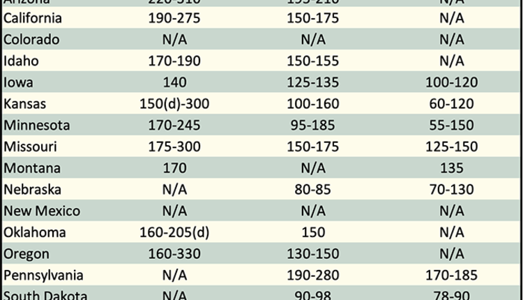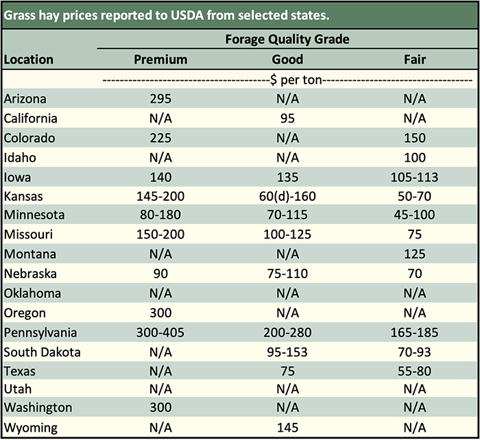 Below are examples of alfalfa and grass prices being paid FOB barn/stack (except for those noted as delivered, which are indicated by a "d" in the table below) for selected states at the end of the day on February 20. Large ranges for a particular grade and state are often indicative of location and/or bale size. Also check the USDA Hay Market Prices for additional locations and more detailed information. NOTE: Many of the state hay reports are now released on a bi-weekly basis.