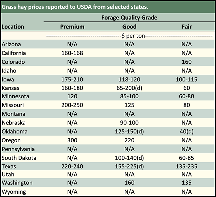 Below are examples of alfalfa and grass prices being paid FOB barn/stack (except for those noted as delivered, which are indicated by a "d" in the table below) for selected states at the end of the day on May 23. Large ranges for a particular grade and state are often indicative of location and/or bale size. Also check the USDA Hay Market Prices for additional locations and more detailed information.