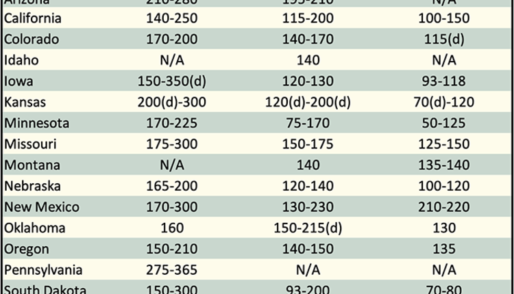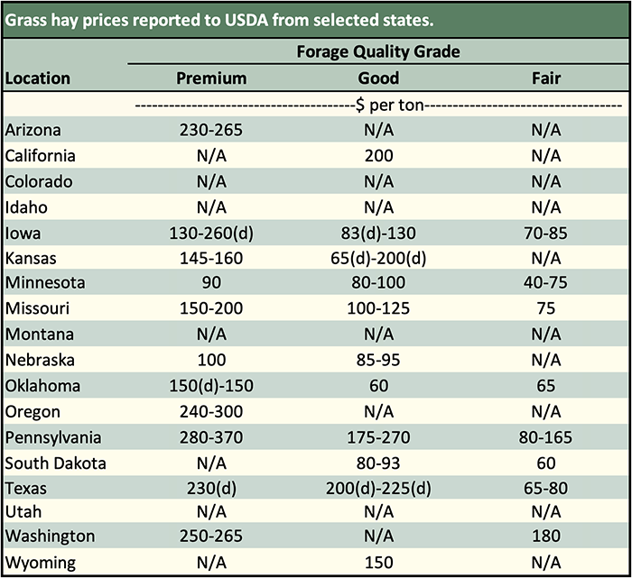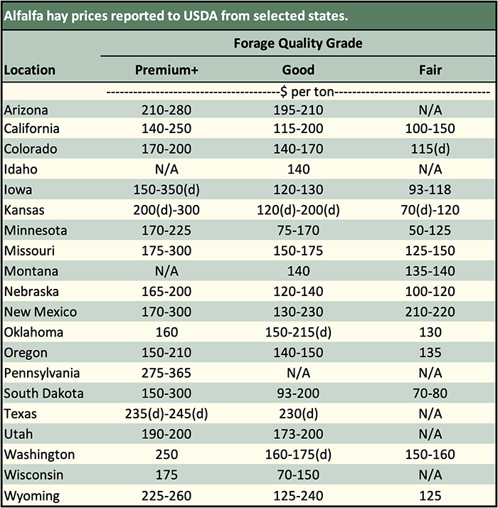 Below are examples of alfalfa and grass prices being paid FOB barn/stack (except for those noted as delivered, which are indicated by a "d" in the table below) for selected states at the end of the day on October 3. Large ranges for a particular grade and state are often indicative of location and/or bale size. Also check the USDA Hay Market Prices for additional locations and more detailed information. NOTE: Many of the state hay reports are now released on a bi-weekly basis.