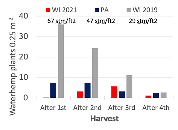 At one of the Wisconsin locations, alfalfa stem density was below that threshold — roughly 29 stems per square foot — but waterhemp density still declined with each forage harvest. “Even though we didn’t have competitive alfalfa, the mowing of those plants still left us with low waterhemp density,” Renz said.