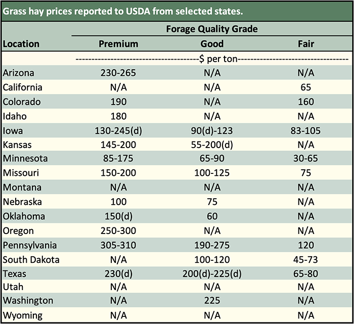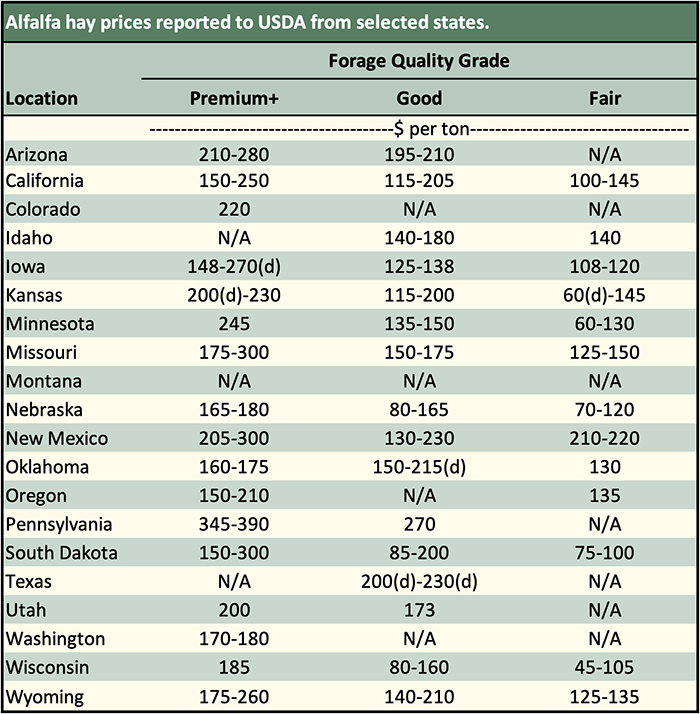 Below are examples of alfalfa and grass prices being paid FOB barn/stack (except for those noted as delivered, which are indicated by a "d" in the table below) for selected states at the end of the day on October 17. Large ranges for a particular grade and state are often indicative of location and/or bale size. Also check the USDA Hay Market Prices for additional locations and more detailed information. NOTE: Many of the state hay reports are now released on a bi-weekly basis.