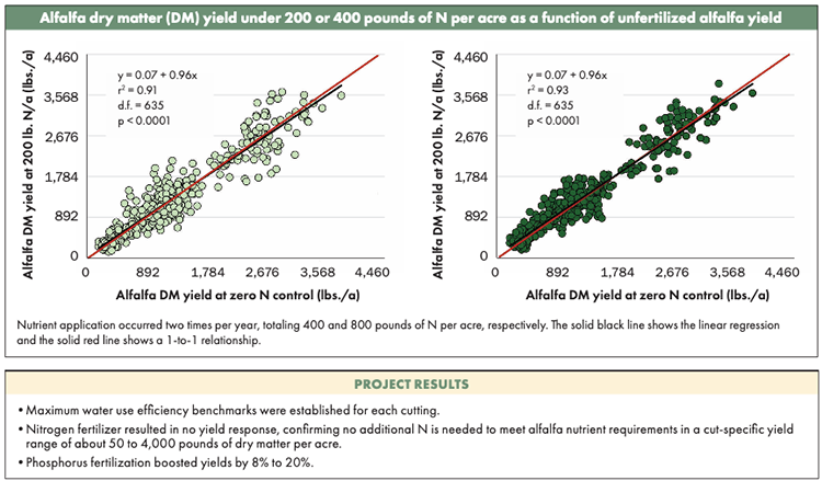 Research began with a systematic literature review to quantify maximum alfalfa water use efficiency per cut under high-yielding conditions. Lollato only included data from high-quality field experiments where alfalfa dry matter yield and associated evapotranspiration were reported for each individual cut. Next, the team performed field trials to measure N limitation across a wide range of yields, varieties, and fertility programs. The multi-year, high-intensity effort generated more than 5,300 individual data points from both main and subsampled cuts.