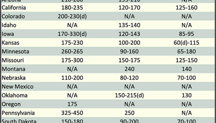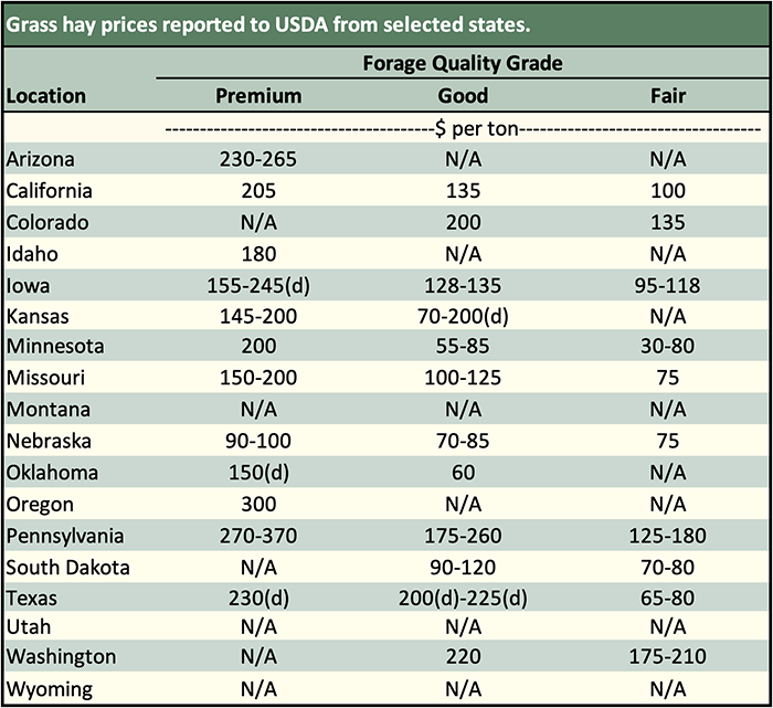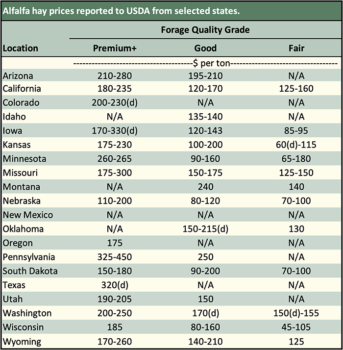 Below are examples of alfalfa and grass prices being paid FOB barn/stack (except for those noted as delivered, which are indicated by a "d" in the table below) for selected states at the end of the day on October 31. Large ranges for a particular grade and state are often indicative of location and/or bale size. Also check the USDA Hay Market Prices for additional locations and more detailed information. NOTE: Many of the state hay reports are now released on a bi-weekly basis.