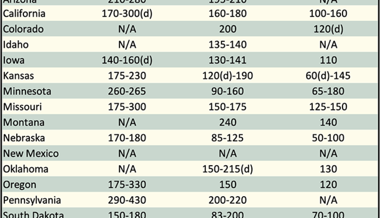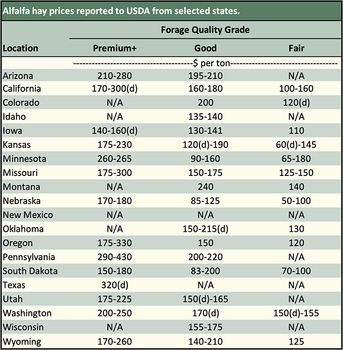Below are examples of alfalfa and grass prices being paid FOB barn/stack (except for those noted as delivered, which are indicated by a "d" in the table below) for selected states at the end of the day on November 7. Large ranges for a particular grade and state are often indicative of location and/or bale size. Also check the USDA Hay Market Prices for additional locations and more detailed information. NOTE: Many of the state hay reports are now released on a bi-weekly basis.