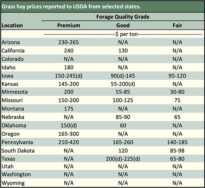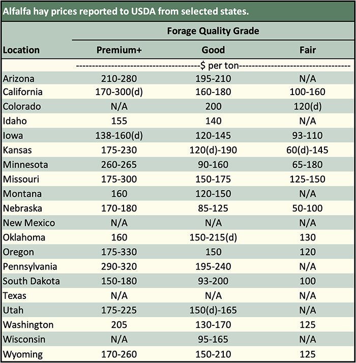 Below are examples of alfalfa and grass prices being paid FOB barn/stack (except for those noted as delivered, which are indicated by a "d" in the table below) for selected states at the end of the day on November 14. Large ranges for a particular grade and state are often indicative of location and/or bale size. Also check the USDA Hay Market Prices for additional locations and more detailed information. NOTE: Many of the state hay reports are now released on a bi-weekly basis.