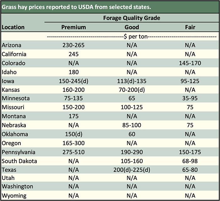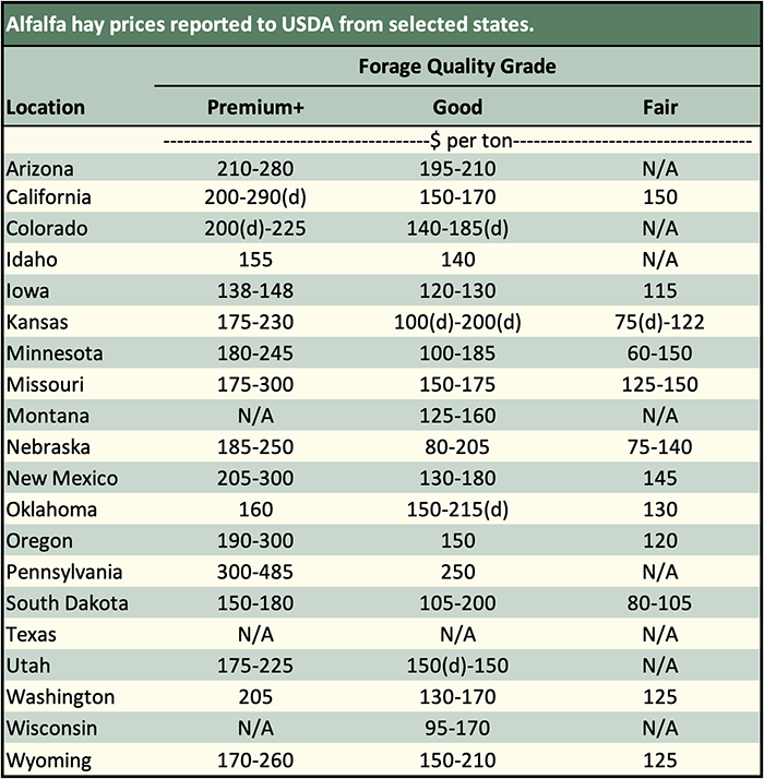 Below are examples of alfalfa and grass prices being paid FOB barn/stack (except for those noted as delivered, which are indicated by a "d" in the table below) for selected states at the end of the day on November 28. Large ranges for a particular grade and state are often indicative of location and/or bale size. Also check the USDA Hay Market Prices for additional locations and more detailed information. NOTE: Many of the state hay reports are now released on a bi-weekly basis.