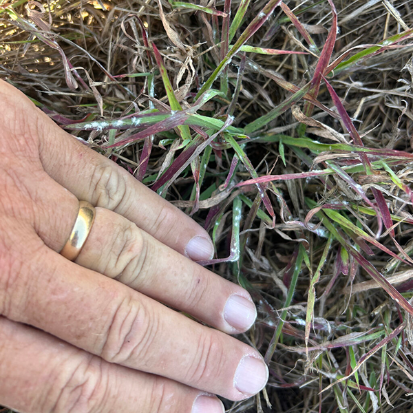 “Early identification is critical, and we need every producer’s eyes on the ground,” Miller asserted. Pasture mealybugs cause feeding damage in the nymph stage, but nymphs are only visible with a magnifier. Adult mealybugs are 2 to 5 millimeters long with fine hairs that extend out on all sides of their oval-shaped bodies. Consider the following tips for effective scouting.