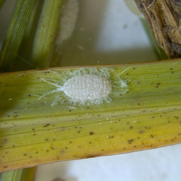 • Search for fluffy, white, waxy, or fuzzy insects on grass blades and stems.