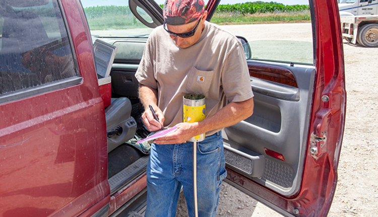 4. Sample at random. It is imperative to get cores from different bales. Even though access to bales in the middle of a stack can be limited, aim to randomize cores as much as possible. Don’t intentionally avoid bales that look bad or select bales that look good.