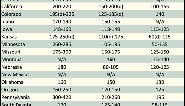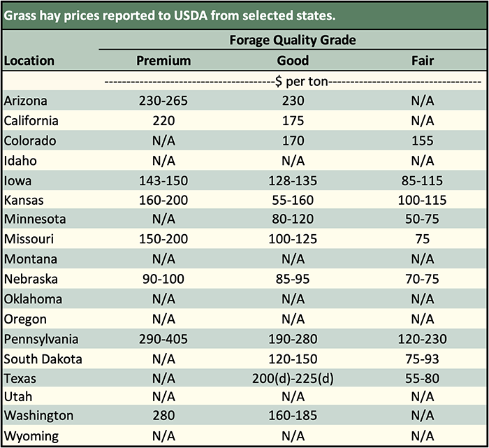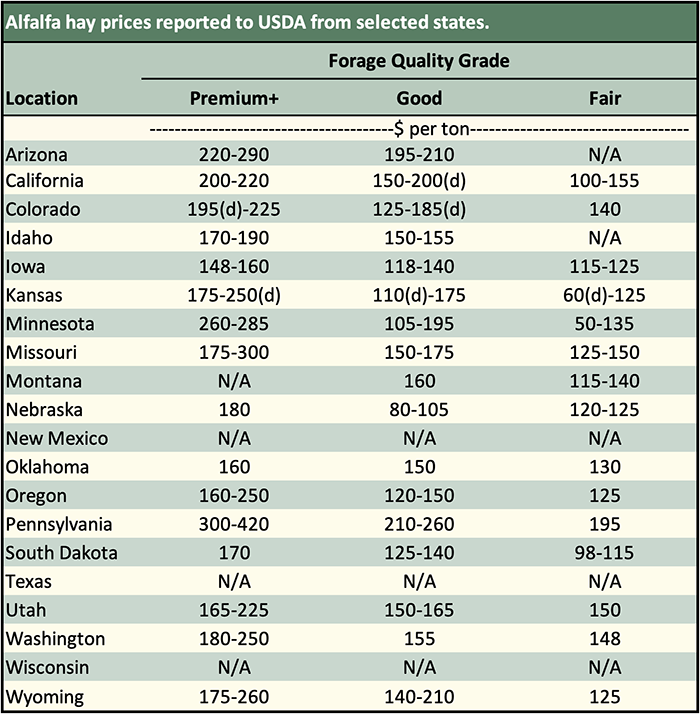 Below are examples of alfalfa and grass prices being paid FOB barn/stack (except for those noted as delivered, which are indicated by a "d" in the table below) for selected states at the end of the day on December 19. Large ranges for a particular grade and state are often indicative of location and/or bale size. Also check the USDA Hay Market Prices for additional locations and more detailed information. NOTE: Many of the state hay reports are now released on a bi-weekly basis.