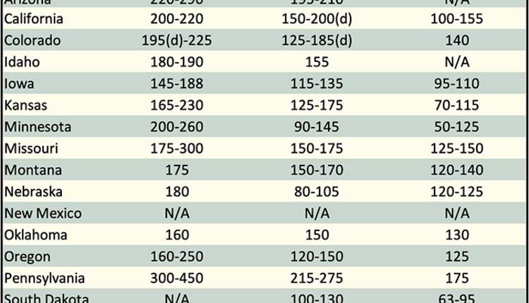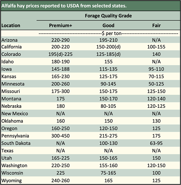 Below are examples of alfalfa and grass prices being paid FOB barn/stack (except for those noted as delivered, which are indicated by a "d" in the table below) for selected states at the end of the day on January 9. Large ranges for a particular grade and state are often indicative of location and/or bale size. Also check the USDA Hay Market Prices for additional locations and more detailed information. NOTE: Many of the state hay reports are now released on a bi-weekly basis.