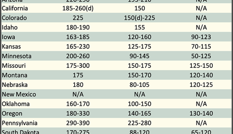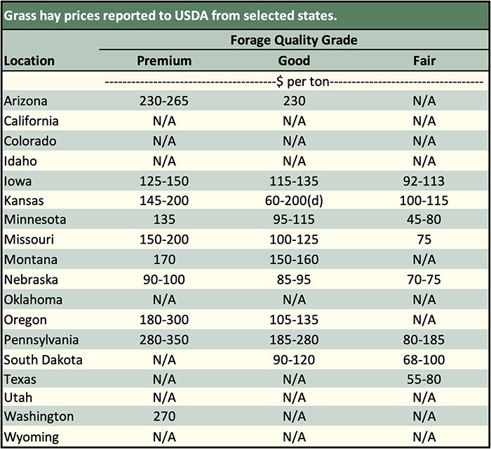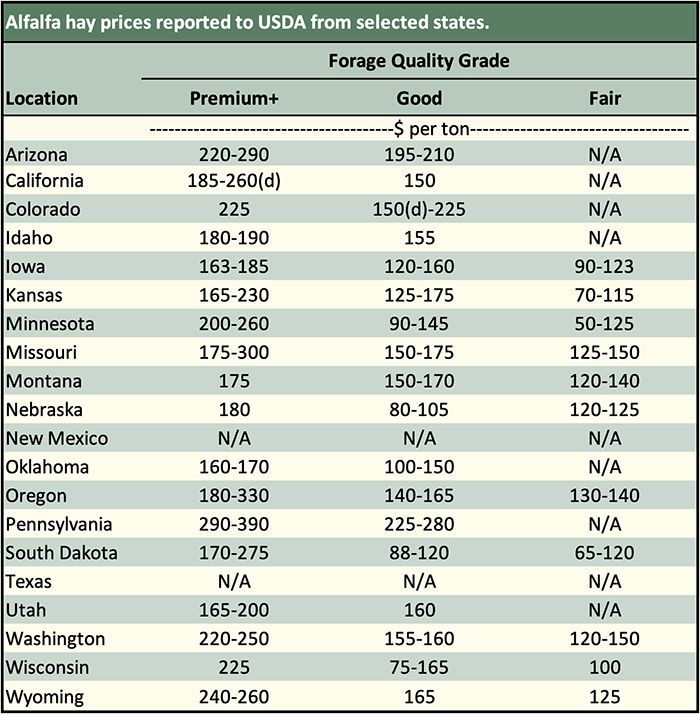 Below are examples of alfalfa and grass prices being paid FOB barn/stack (except for those noted as delivered, which are indicated by a "d" in the table below) for selected states at the end of the day on January 16. Large ranges for a particular grade and state are often indicative of location and/or bale size. Also check the USDA Hay Market Prices for additional locations and more detailed information. NOTE: Many of the state hay reports are now released on a bi-weekly basis.
