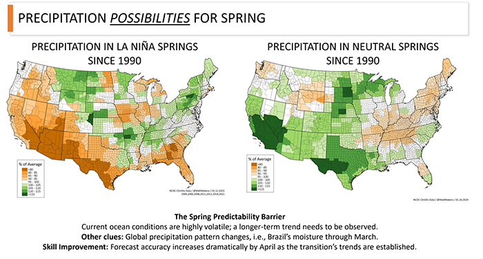 Depending on how quickly La Niña exits the scene, Makens said the possible outlooks for this spring include a few extra months of her dry weather or a few months of more neutral conditions. “If we hold onto La Niña for a little bit longer, we are still very dry in the Southwest. If we can get rid of her quickly, you can see where the moisture spreads from the Southwest, through Texas, and all the way to the Upper Midwest,” Makens said