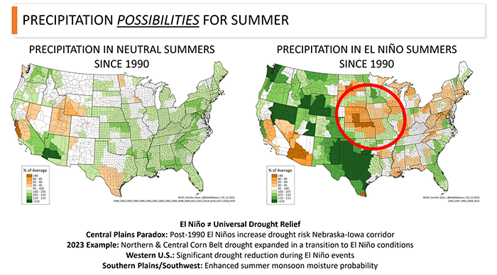 The summer outlook options include ENSO neutral or El Niño. In the event that El Niño comes running, the Corn Belt is predicted to experience a rapid onset of drought, which was demonstrated in the summer of 2023.