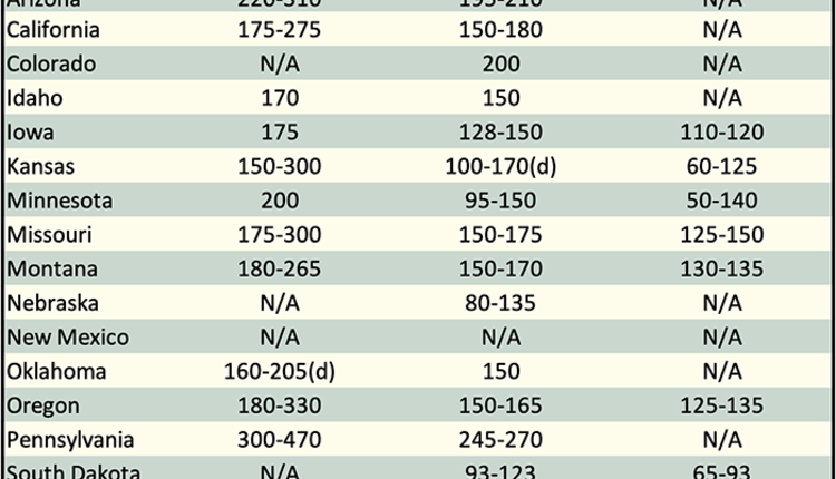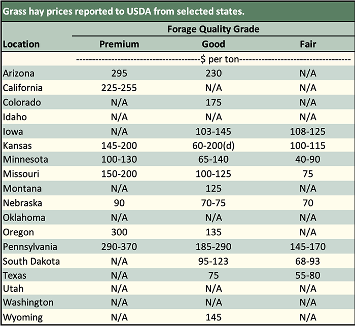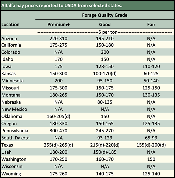 Below are examples of alfalfa and grass prices being paid FOB barn/stack (except for those noted as delivered, which are indicated by a "d" in the table below) for selected states at the end of the day on February 6. Large ranges for a particular grade and state are often indicative of location and/or bale size. Also check the USDA Hay Market Prices for additional locations and more detailed information. NOTE: Many of the state hay reports are now released on a bi-weekly basis.