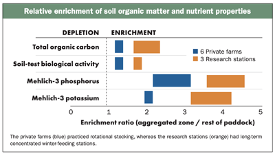 When defining an enrichment zone with elevated soil properties from four neighboring samples, the concentration of nutrients was associated with factors such as tree shade, drinking water location, or gates. These features attracted animals and led to feces and urine deposition, and the areas may have become denuded and susceptible to runoff loss and/or loss of forage. Hay feeding stations also attracted livestock and caused them to preferentially occupy smaller portions of a pasture. This led to an import and accumulation of organic nutrients in enrichment zones. Repeated animal behavior patterns that create enrichment zones and/or an accumulation of organic matter can enhance both soil microbial activity and sequestration of soil organic carbon.