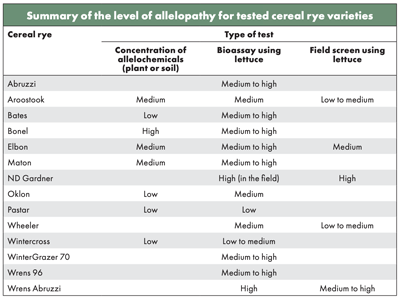 The capacity of producing allelopathic substances is genetic and ranges from zero to highly allelopathic. Consequently, we may be able to select for cereal rye varieties with or without allelopathy, depending on our needs and production goals.