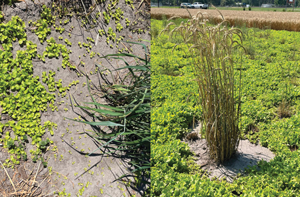Analyzing the plant material itself or the soil where an allelopathic plant grew to estimate the concentration of allelopathic substances is also possible in laboratory settings, but it’s not common. Evaluating allelopathy in the field, rather than the laboratory, tends to offer a better estimate of how cereal rye would suppress weeds in a farm field. In the field, the Cover Crop Breeding Network (www.covercropbreeding.com) evaluates allelopathy by planting lettuce at a high seeding rate around cereal rye plants. If the plant is allelopathic, lettuce will not grow near the plant, forming either a halo of bare soil around it or a gradient of stunted lettuce plants in relation to their distance from the cereal rye plant (see photo). It is unknown whether results from tests using lettuce will translate to similar allelopathy damage in other crops such as alfalfa.
