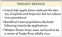 Greenhouse studies did not support the hypothesis that western flower thrips are a vector of SRAV. Both inoculated plants and thrips tested negative for the virus, suggesting thrips are not responsible for SRAV transmission. From a management perspective, the results suggest that targeting insecticide applications solely to manage virus vectors in alfalfa may offer limited economic benefit. While insecticides temporarily reduce the populations of aphids and thrips, those reductions did not translate into improved crop performance.