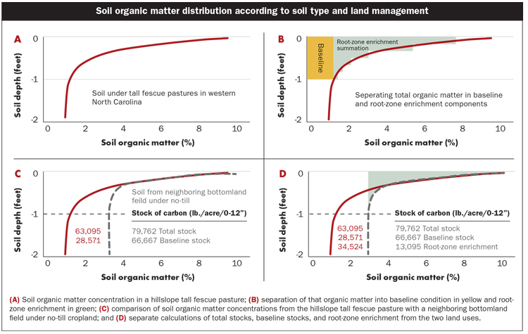 The figure illustrates a typical nature of soil organic matter distribution and how soil type and land management play a role in changing this distribution. Soil carbon was measured and reported as organic matter; soil organic matter is composed of 58% carbon. When determining the carbon concentration at a 12-inch depth, a baseline condition attributable to historical pedogenic factors is ascertained. Subtracting this baseline condition from the total distribution of soil organic carbon leaves an estimate of root-zone enrichment of soil organic carbon, which is attributable to contemporary management that has influence in the zero-to-12-inch layer.