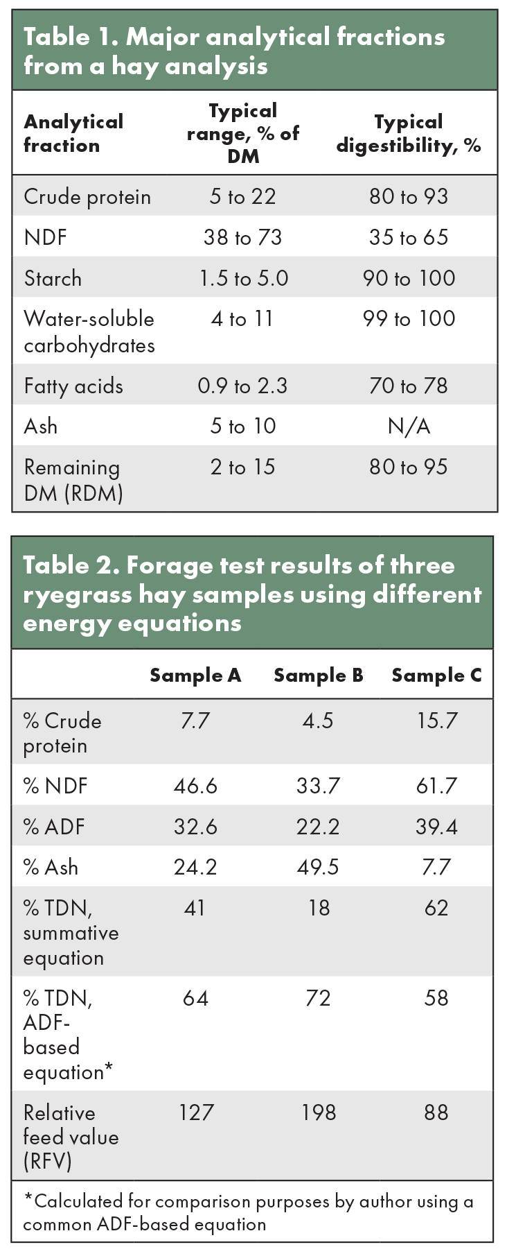 To better understand differences in hay tests, it is valuable to look at the major analytical fractions reported on one. Table 1 shows these analytical fractions, typical ranges for each fraction, and their expected ranges of digestibility.