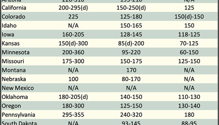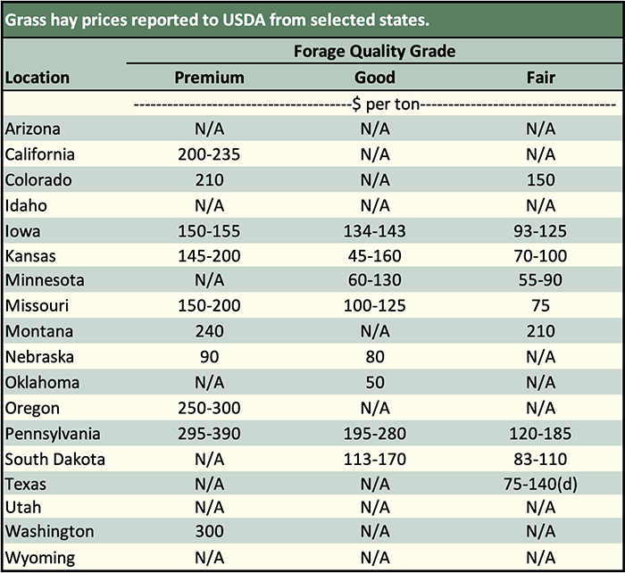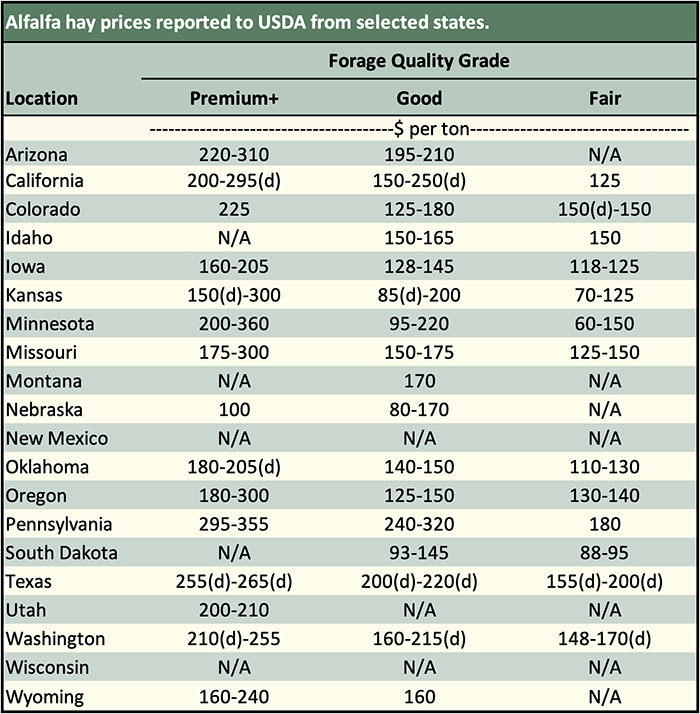 Below are examples of alfalfa and grass prices being paid FOB barn/stack (except for those noted as delivered, which are indicated by a "d" in the table below) for selected states at the end of the day on March 27. Large ranges for a particular grade and state are often indicative of location and/or bale size. Also check the USDA Hay Market Prices for additional locations and more detailed information. NOTE: Many of the state hay reports are now released on a bi-weekly basis.