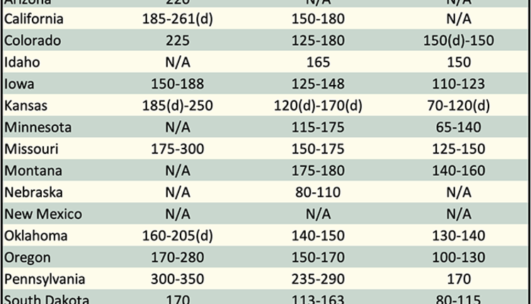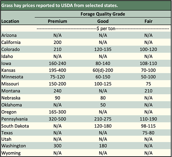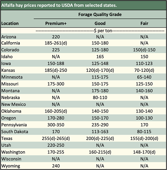 Below are examples of alfalfa and grass prices being paid FOB barn/stack (except for those noted as delivered, which are indicated by a "d" in the table below) for selected states at the end of the day on April 10. Large ranges for a particular grade and state are often indicative of location and/or bale size. Also check the USDA Hay Market Prices for additional locations and more detailed information. NOTE: Many of the state hay reports are now released on a bi-weekly basis.