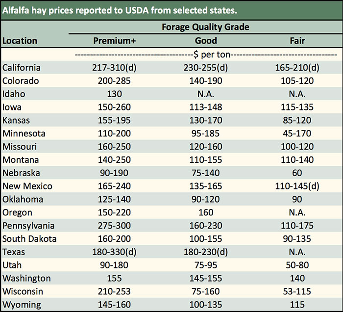 Below are examples of alfalfa and grass prices being paid FOB barn/stack (except for those noted as delivered, which is indicated by a "d" in the table below) for selected states at the end of the day on Friday, January 12. Large ranges for a particular grade and state are often indicative of location and/or bale size. Also check the USDA Hay Market Prices for additional locations and more detailed information.