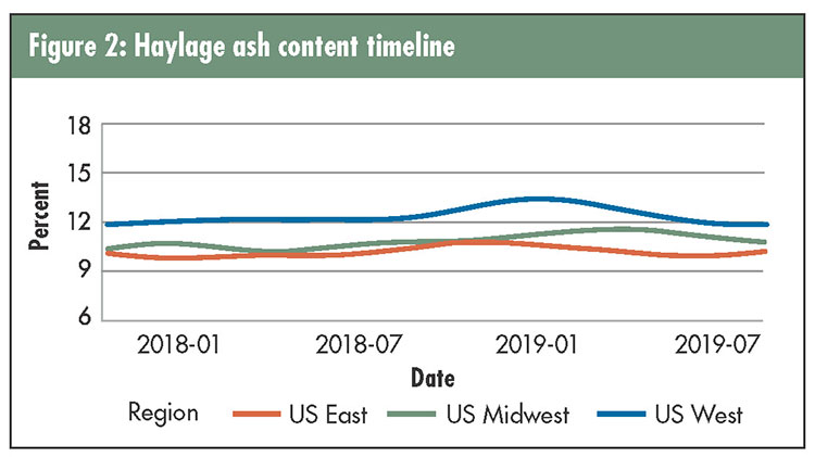A less recognized factor with many 2019 haylage crops is an elevated ash content. The western U.S. typically experiences greater ash content in forage crops, however, there appears to be convergence for the Midwest and western U.S. in 2019 (see Figure 2).