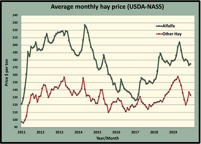 The average U.S. price for both alfalfa and hay other than alfalfa ended the year $4 per ton below December 2018.