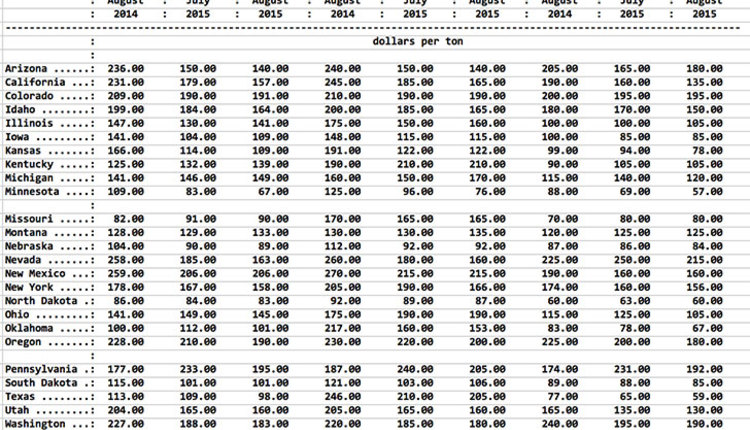 Prices for all hay and alfalfa declined about $10 per ton from July to August in the most recent NASS Agricultural Prices report. In most states, prices either remained steady or declined. Alfalfa prices are $48 per ton lower this year compared to one year ago.