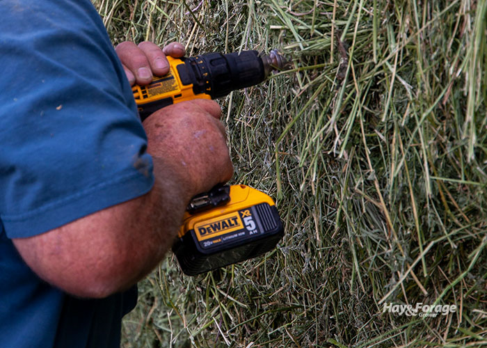 The forage specialist recommends that you core rectangular bales by centering the probe in the end and inserting the probe horizontally into the bale. Sample round bales by drilling or pushing the probe horizontally into center of the rounded side of the bale. Remove weathered material from the area to be probed prior to sampling. “Weathered material represents refusal and should not be included in the sample,” Teutsch noted. The probe should penetrate the bale at least 15 to 18 inches for rectangular or round bales.
