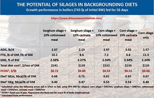 “The expected gains from diets using corn or sorghum silages as the base forage while correcting for adequate protein can be in the range of 1.5 to 3 pounds per head per day,” DiLorenzo notes. “This range in weight gains creates much needed flexibility in feeding systems that use strategic feed resources to develop heifers, background calves, or winter lactating cows, targeting optimal rates of gain for each category.”