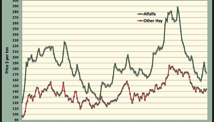 Six states had a double-digit decline in average alfalfa price. California, Ohio, Arizona, Nevada, Oklahoma, and Minnesota were all down by $10 per ton.