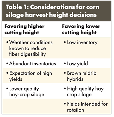 Several studies have evaluated the impact of chop height on corn silage. While the magnitude of the impact varies by study, the overall conclusion is chopping corn silage higher results in less yield, but higher fiber digestibility and starch content. Considering this information in the context of the current growing season can help you refine your harvest strategy (see Table 1). In the event of a wet growing season, we might expect average to above average yields with lower fiber digestibility. Coupling this outlook with adequate feed inventory would suggest that a higher cutting height could help offset the effects of the wet season.