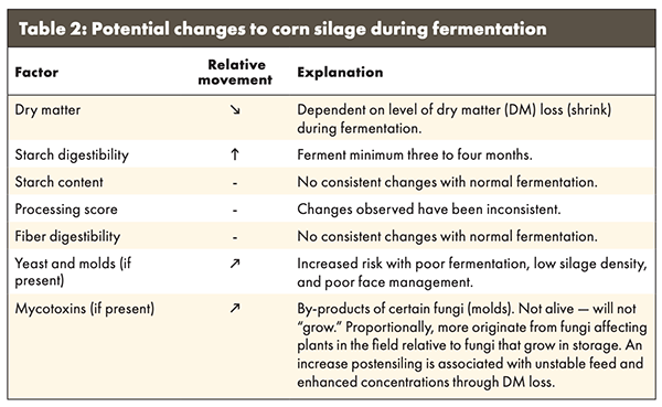 Fresh-chopped samples are also a useful way to begin strategizing for feedout. Except for starch digestibility, which improves with fermentation, there are few significant changes that take place during storage. Table 2 provides general trends and considerations for key silage metrics.