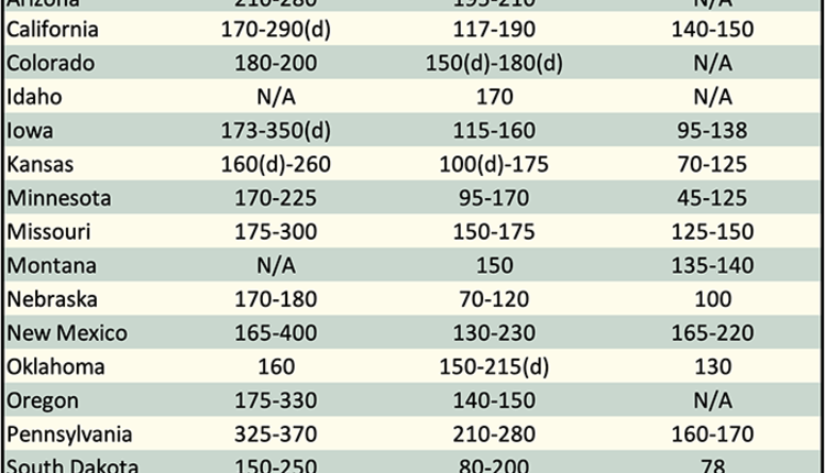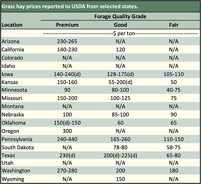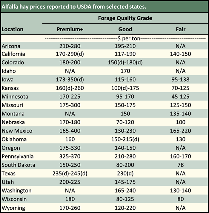 Below are examples of alfalfa and grass prices being paid FOB barn/stack (except for those noted as delivered, which are indicated by a "d" in the table below) for selected states at the end of the day on September 19. Large ranges for a particular grade and state are often indicative of location and/or bale size. Also check the USDA Hay Market Prices for additional locations and more detailed information. NOTE: Many of the state hay reports are now released on a bi-weekly basis.