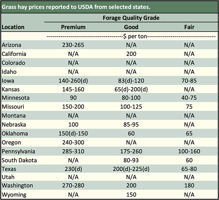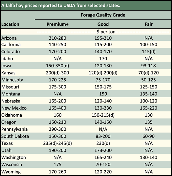 Below are examples of alfalfa and grass prices being paid FOB barn/stack (except for those noted as delivered, which are indicated by a "d" in the table below) for selected states at the end of the day on September 26. Large ranges for a particular grade and state are often indicative of location and/or bale size. Also check the USDA Hay Market Prices for additional locations and more detailed information. NOTE: Many of the state hay reports are now released on a bi-weekly basis.