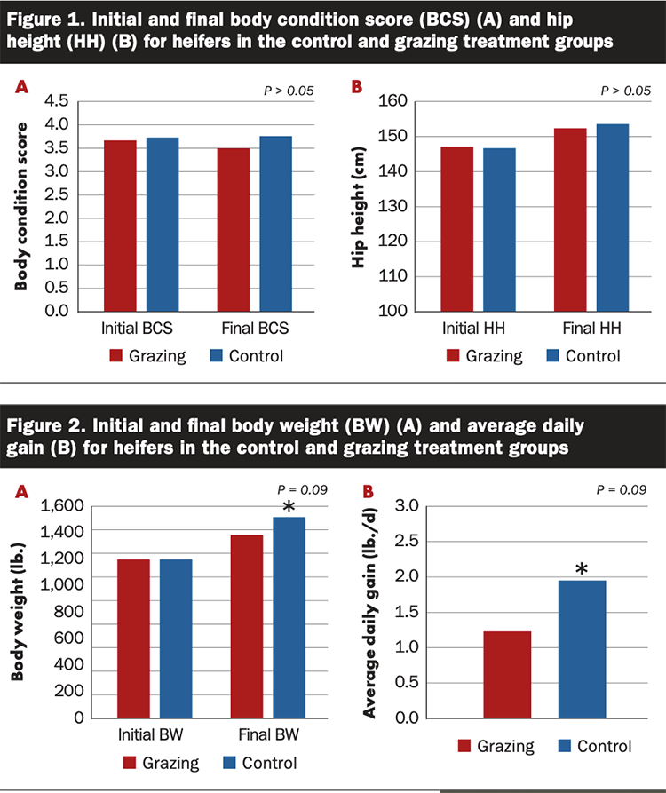 Initial body weight, body condition score, and hip height were similar between treatment groups, with heifers averaging 1,161 pounds and 3.7 body condition score when they started grazing. Final body condition score and hip height were not statistically different between the two treatment groups (Figure 1). However, average daily gain and final body weight tended to be lower for the ROT heifers compared to the CON heifers (Figure 2). Final body weight and average daily gain for the ROT heifers were 1,359 pounds and 1.3 pounds of gain per day, respectively, whereas final body weight and average daily gain for the CON heifers were 1,499 pounds and 1.9 pounds of gain per day, respectively.