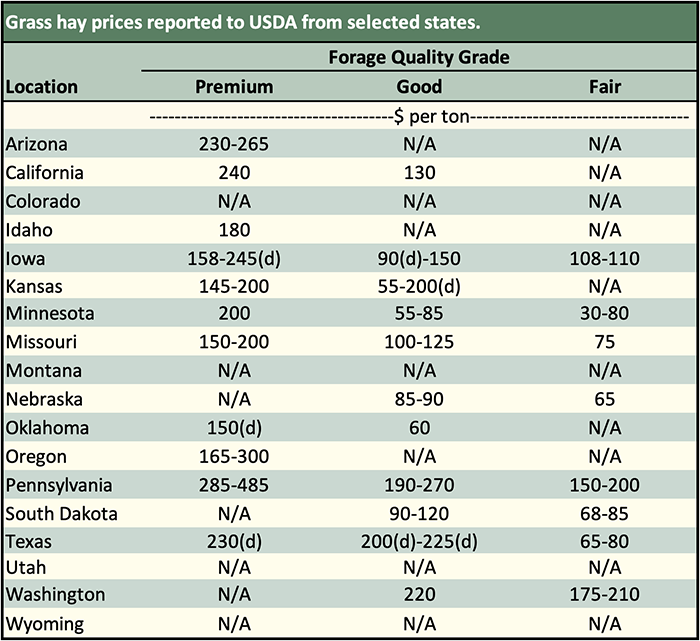 Below are examples of alfalfa and grass prices being paid FOB barn/stack (except for those noted as delivered, which are indicated by a "d" in the table below) for selected states at the end of the day on November 7. Large ranges for a particular grade and state are often indicative of location and/or bale size. Also check the USDA Hay Market Prices for additional locations and more detailed information. NOTE: Many of the state hay reports are now released on a bi-weekly basis.